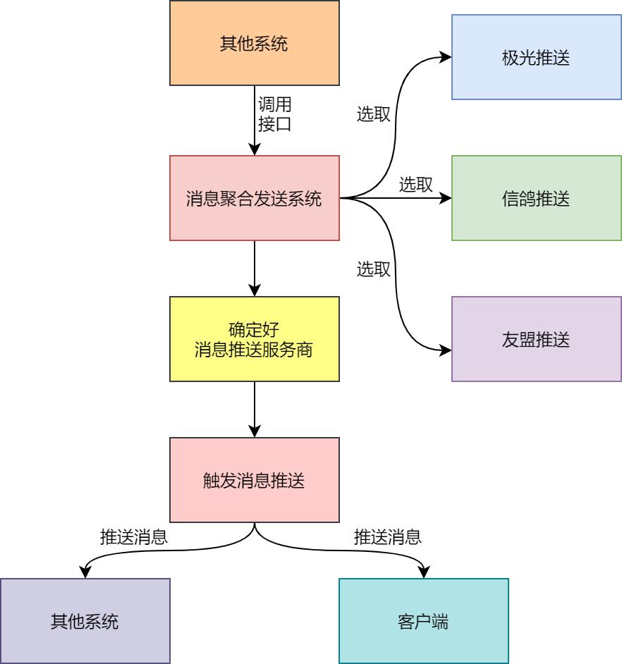 消息聚合发送系统属于公司整体项目的一个子系统,用来支撑公司项目的消息聚合和发送业务,并且消息的发送功能会聚合多个消息推送服务商,比如极光推送,信鸽推送,友盟推送等等。如图6-1所示。
