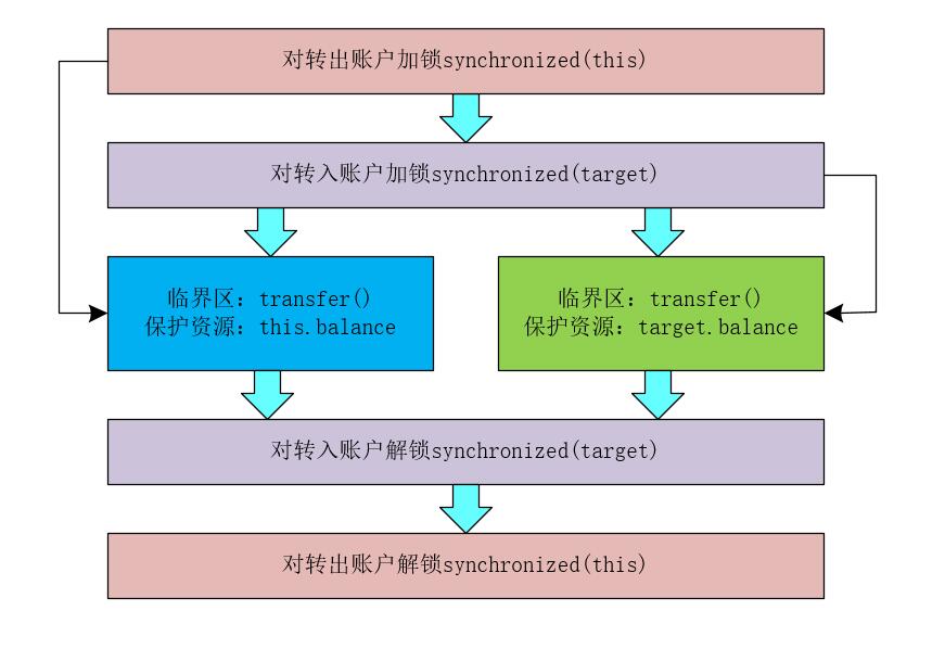 仔细分析下上面的代码业务,上述代码的转账操作中,涉及到转出账户this和转入账户target,所以,我们可以分别对转出账户this和转入账户target加锁,只有两个账户加锁都成功时,才执行转账操作。这样就能够做到账户A为账户B转账的操作和账户C为账户D转账的操作完全可以并行执行。