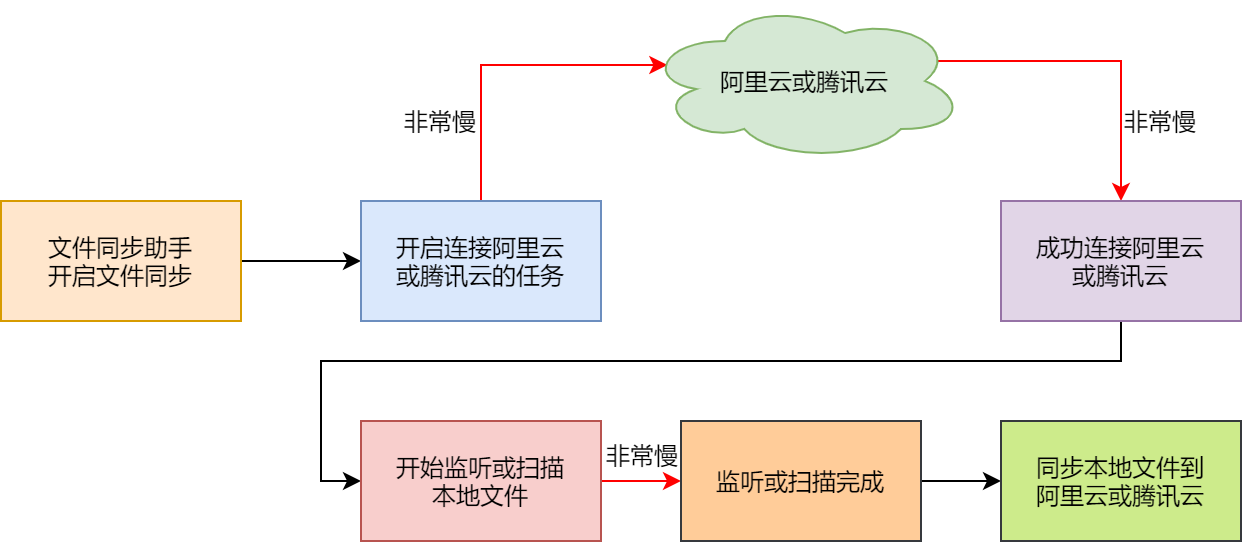 可以看到,如果连接远程服务器的任务和监听或者扫描本地文件的任务执行非常慢,在这种串行执行任务的模式下,要经过较长的时间才能开始同步文件到远程服务器,性能是非常差的。