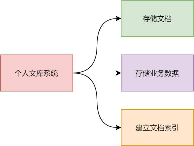 对于个人文库系统来说,用户可以将自己的文档上传到文库中进行管理,个人文库系统会存储这些文档,并且会存储用户的业务数据。另外,个人文库系统后续根据用户的需要,可以根据文档的名称、文档里的关键词进行检索,以便快速定位和搜索用户上传过的文档,这就需要为上传的文档简历索引。所以,对于个人文库项目来说,核心业务有三个,分别是:存储文档、存储业务数据、建立文档索引,如图24-1所示。