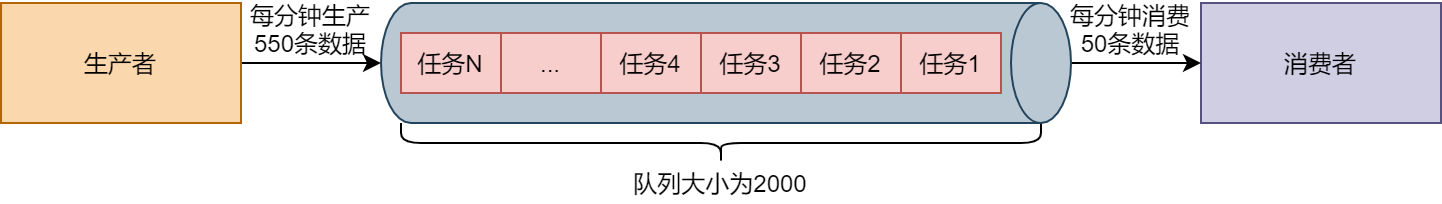 可以看到,当阻塞队列的大小为2000时,如果生产者每分钟生产550条数据,而消费者每分钟只能消费50条数据时,4分钟后,阻塞队列中就会堆满待处理的任务。