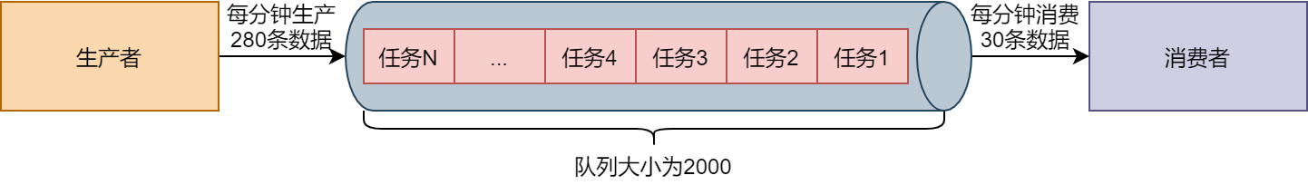 可以看到,当阻塞队列的大小为2000时,如果生产者每分钟生产280条数据,而消费者每分钟只能消费30条数据时,8分钟后,阻塞队列中就会堆满待处理的任务。
