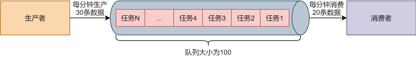 可以看到,当阻塞队列的大小为100,如果生产者每分钟生产30条数据,而消费者每分钟只能消费20条数据,10分钟后,阻塞队列中就会堆满待处理的任务。