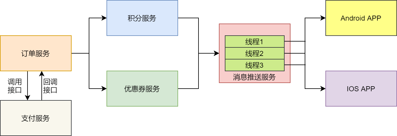 这种只要有用户下单支付成功后了,为用户增加积分和优惠券成功,就创建一个线程为用户推送消息的方式可行吗?我们继续分析。
