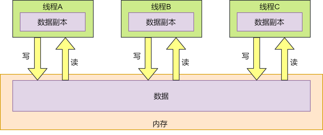 可以看到,当多个线程对内存中的同一个数据进行读取和修改操作时,每个线程都会在自己本地存储一份这个数据的副本,假设此时内存中的数据为0,线程A、线程B和线程C同时读取到了内存中的数据,都对数据进行加1操作。三个线程执行完的期望结果是3,但实际结果却是小于3。