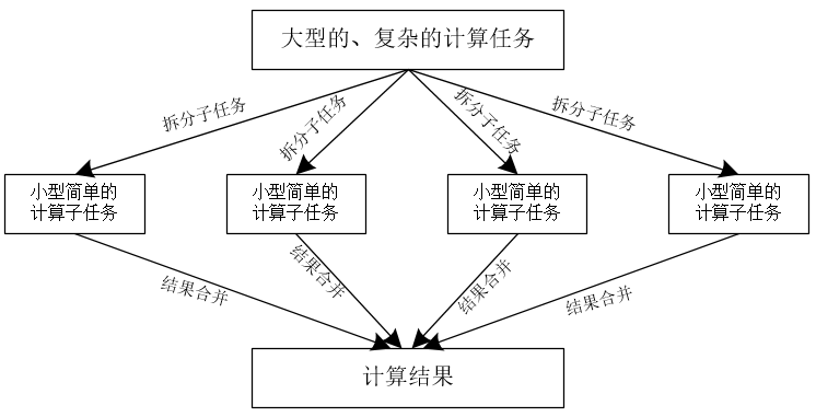 这点类似Hadoop中的MapReduce,Hadoop的MapReduce框架会将一个大型的、复杂的计算任务,拆分成多个小型的、简单的计算子任务,每个子任务在框架中都是高度并行计算的,之后MapReduce框架将各个计算子任务的计算结果进行合并,得出最终的计算结果。