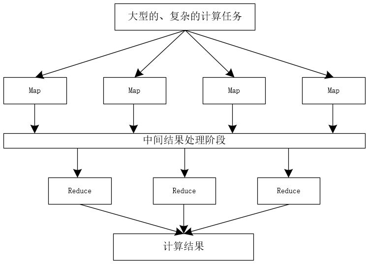 MapReduce框架将一个大型的、复杂的计算任务拆分为多个小的、简单的计算任务交由多个map并行计算,每个map的计算结果由中间结果处理阶段的处理后,输入reduce阶段,reduce阶段将输入的数据,进行合并处理,输出最终的计算结果。