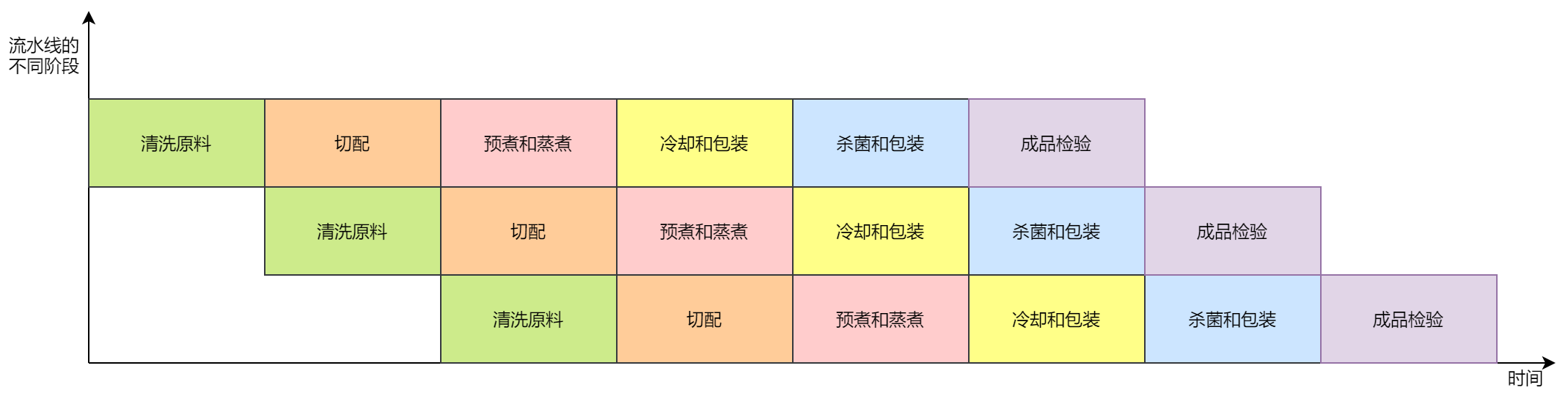 可以看到,在食品加工厂的流水线上,会将一个流水线的操作划分成多个工序,每个流水线的不同工序之间是可以并行处理的,这样就不必等到一个流水线的所有操作都完成后,再去开启下一个流水线操作,以此来提升整体的加工效率。