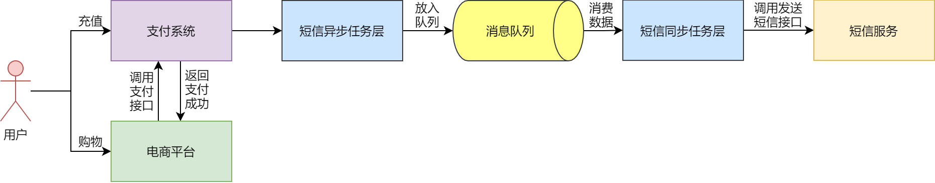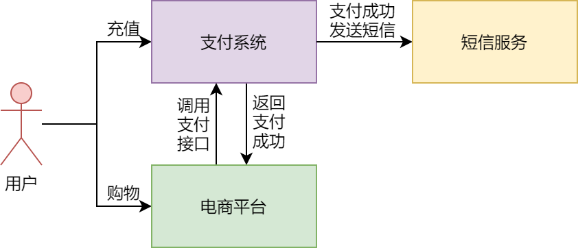 可以看到,用户在电商平台下单并支付成功后,发送短信的任务会由短信异步任务层将任务放入消息队列,短信同步任务层会消费消息队列中的数据,调用短信服务的接口发送短信。这样,通过消息队列解耦了支付逻辑和发送短信的逻辑。