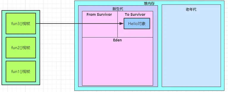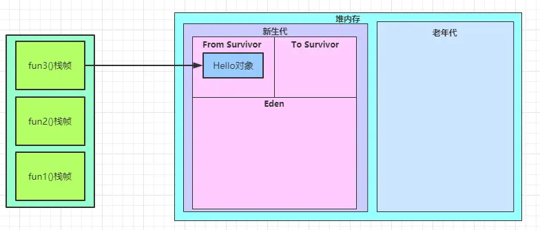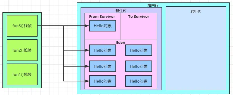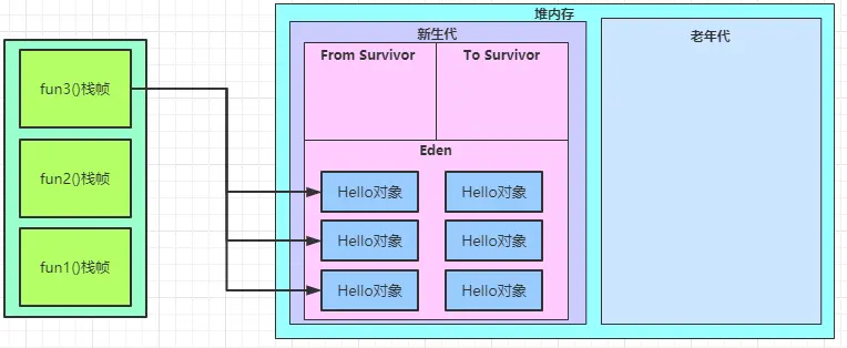 堆内存分为新生代和老年代,新生代是用于存放使用后准备被回收的对象,老年代是用于存放生命周期比较长的对象。大部分我们创建的对象,都属于生命周期比较短的,所以会存放在新生代。新生代又细分Eden空间、From Survivor空间、To Survivor空间,我们创建的对象,对象优先在Eden分配。