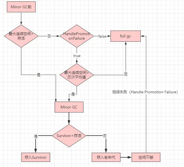- 如果大于,发起Minor GC。Minor GC后,看Survivor空间是否足够存放存活对象,如果不够,就放入老年代,如果够放,就直接存放Survivor空间。如果老年代都不够放存活对象,担保失败(Handle Promotion Failure),发起full gc。
