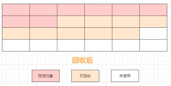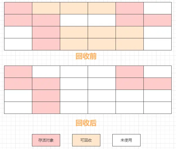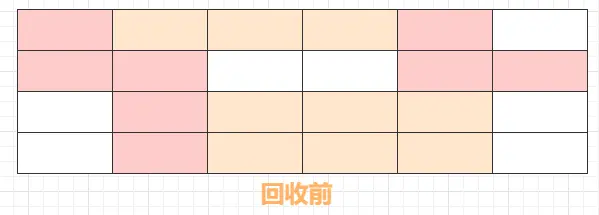 标记-清除算法就是,先标记哪些对象是存活的,哪些对象是可以回收的,然后再把标记为可回收的对象清除掉。从下面的图可以看到,回收后,产生了大量的不连续的内存碎片,如果这个时候,有一个比较大的对象进来,却没有一个连续的内存空间给他使用,又会触发一次垃圾收集动作。