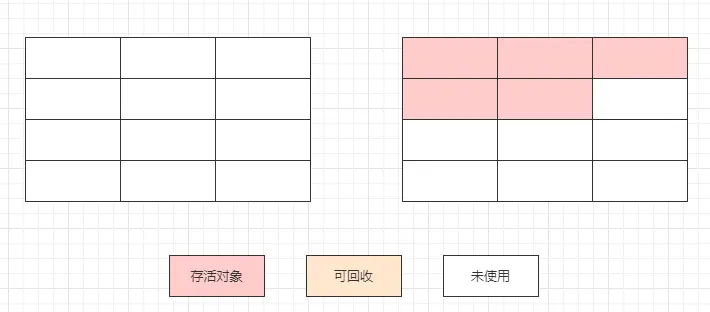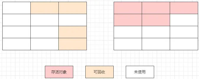 复制算法是通过两个内存空间,把一方存活的对象复制到另外一个内存空间上,然后再把自己的内存空间直接清理。 标记后,此时情况如下: