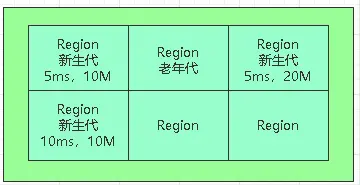 比如下图,第一个新生代的Region回收10M需要5ms,第二个新生代的Region回收20M也只要5ms,第三个新生代的Region回收10M却需要10ms,如果指定他需要5ms内回收20M的垃圾,他会直接去回收第二个新生代的Region,而不是回收第一个和第三个新生代的Region。