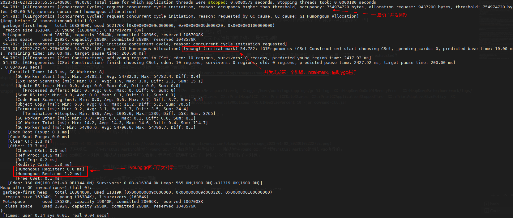 我从gc日志中发现了一次由initial marking触发的young gc,说明g1启动了并发周期,之所以发生young gc,是因为initial marking是借助ygc执行的。