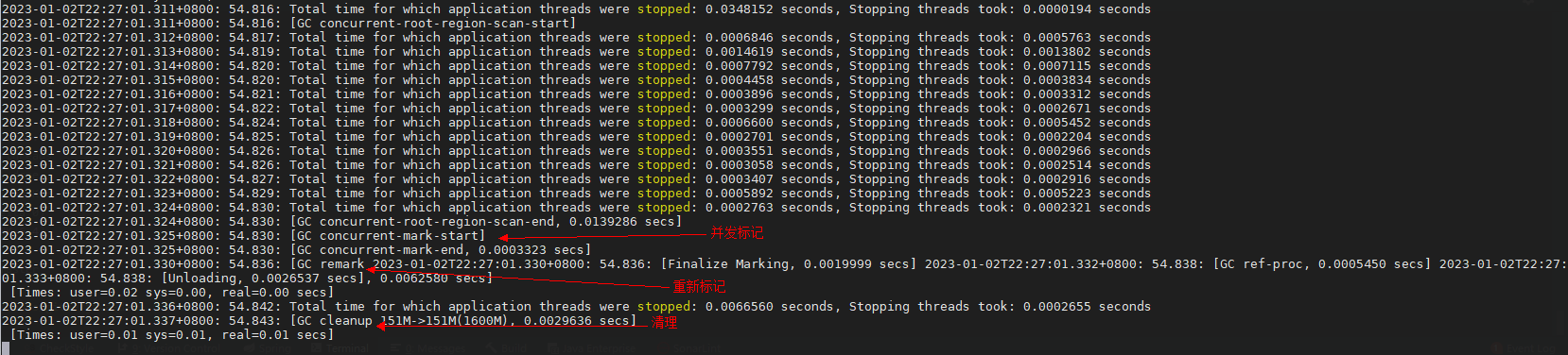 紧接着,我发现了并发标记、重新标记与清理阶段的日志。