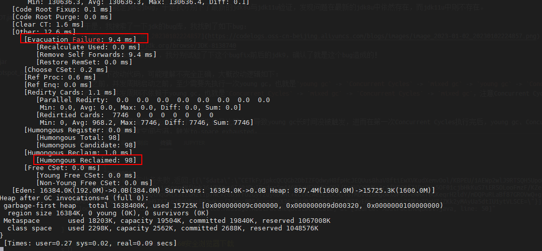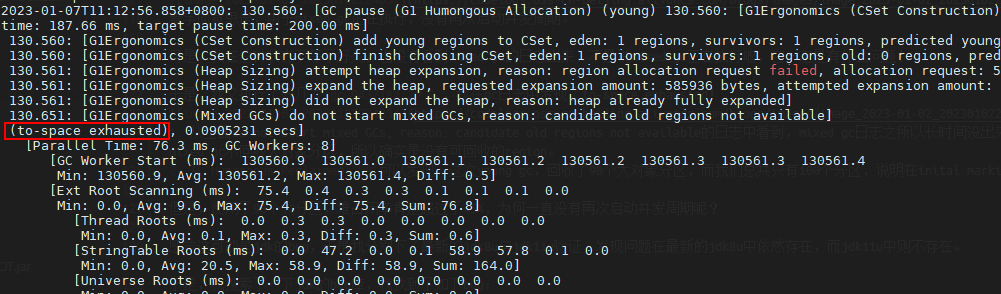 我忽然想到,莫非是俄罗斯环境流量太低,触发不了young gc,且并发周期又因为什么原因没执行,但定时任务又慢慢生成大对象将old region占满,导致了to-space exhausted?