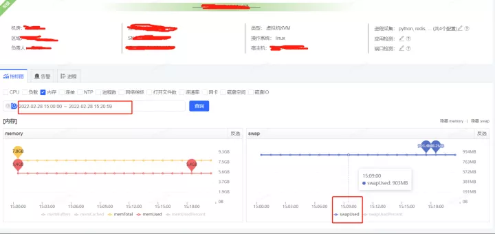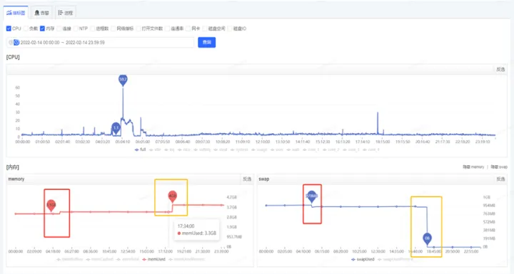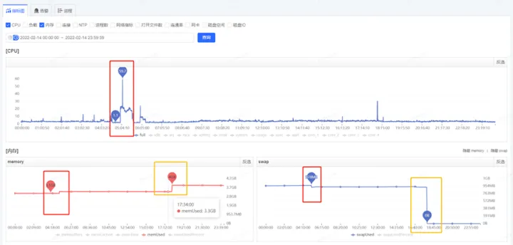 获取到了GC耗时的时间后,通过监控平台获取到各个监控项,开始排查这个时点有异常的指标,最终分析发现,在5.06分左右(GC的时点),CPU占用显著提升,而SWAP出现了释放资源、memory资源增长出现拐点的情况(详见下图红色框,橙色框中的变化是因修改配置导致,后面会介绍,暂且可忽略)
