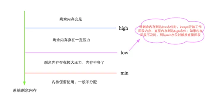 Linux会在两种场景下触发内存回收,一种是在内存分配时发现没有足够空闲内存时会立刻触发内存回收;另一种是开启了一个守护进程(kswapd进程)周期性对系统内存进行检查,在可用内存降低到特定阈值之后主动触发内存回收。