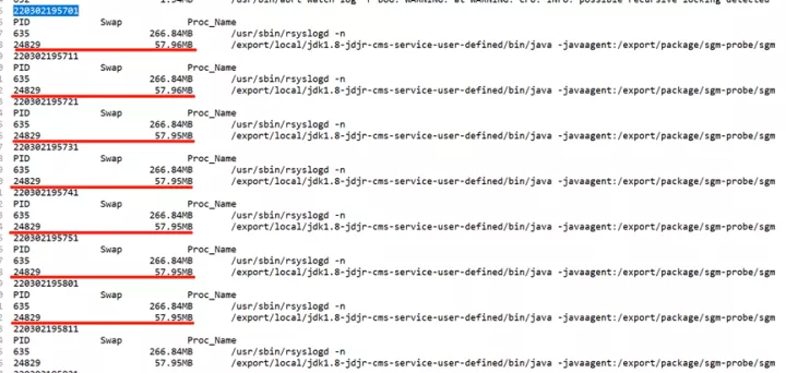 由于上面图中 2022.3.2 19:57:00 至 2022.3.2 19:58:00 发生了一次Full GC,我们重点关注下这一分钟内swap交换区的变化即可,我这里每10s做一次信息采集,可以看到在GC时点前后,swap确实没有变化
