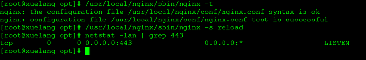 配置文件修改完毕后,用nginx -t 测试下配置无误,就reload一下nginx服务,检查443端口是否在监听: