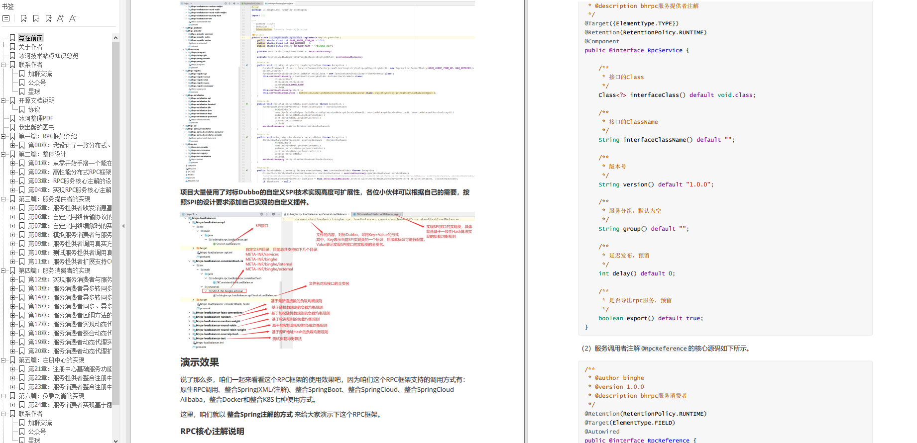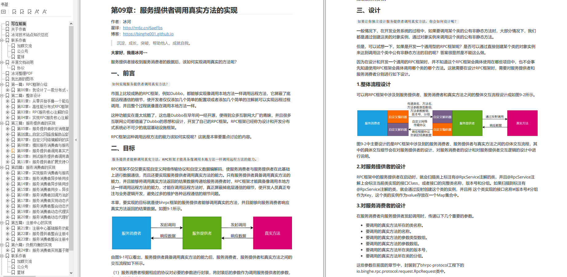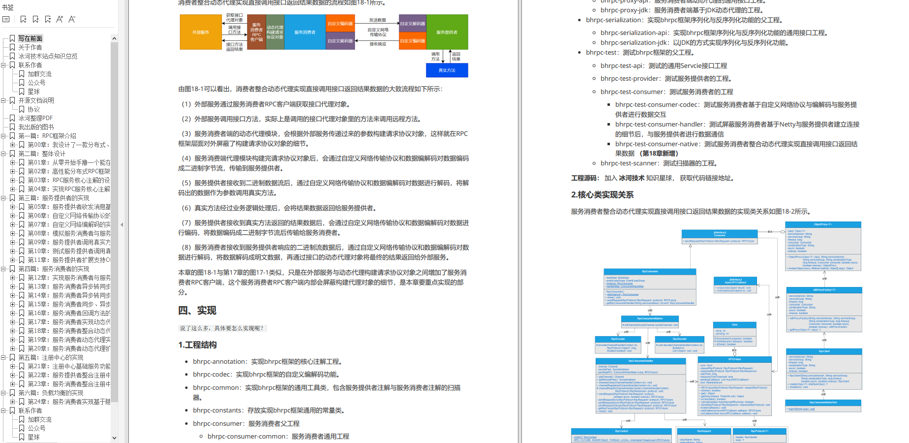 本电子主要分为六大篇章,分别为:RPC框架介绍、整体设计、服务提供者的实现、服务消费者的实现、注册中心的实现和负载均衡的实现。