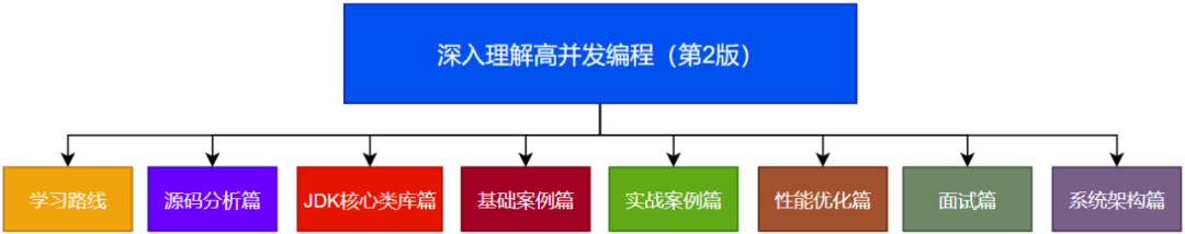 《深入理解高并发编程(第2版)》包含:并发编程学习路线、源码分析篇、JDK核心类库篇、基础案例篇、实战案例篇、性能优化篇、面试篇和系统架构篇等八个大的篇章。