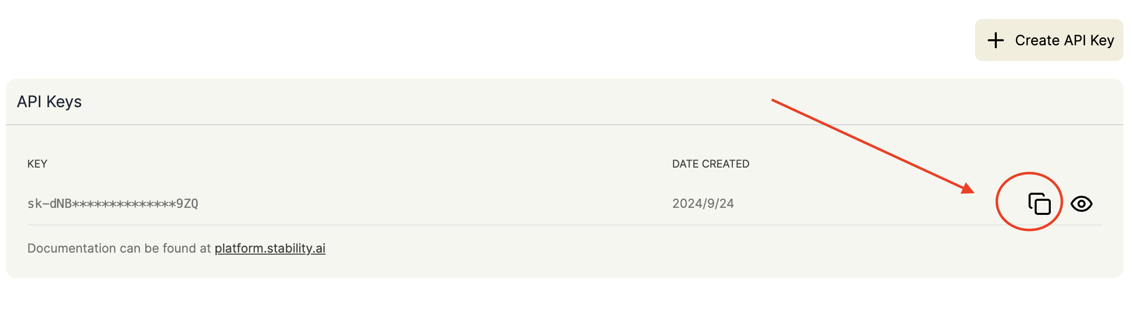成功登录后,进入API密钥管理页面,点击复制按钮获取密钥:。