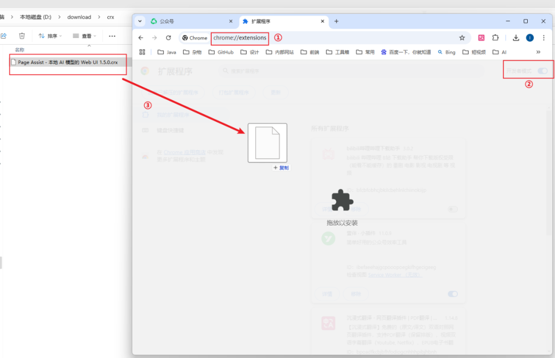 下载到本地,谷歌浏览器打开:chrome://extensions/,右上角打开开发者模式,将下载好的crx文件拖入浏览器,完成插件的安装。