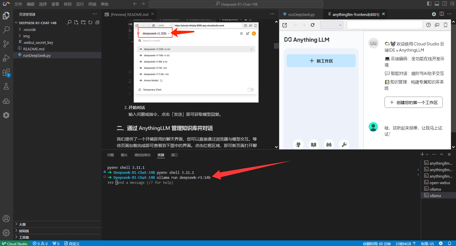 实际我们在《第02节:DeepSeek R1蒸馏模型组本地部署与调用 (opens new window)》一节中,我们通过Cloud Studio搭建的环境中,已经安装并启动了Ollama。所以,我们可以直接输入如下命令通过Ollama运行deepseek-r1:14b模型。