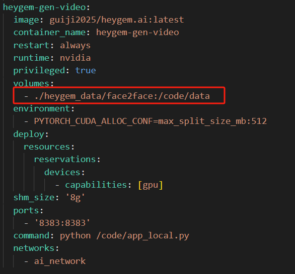 找到文件中两处数据卷映射配置,将Windows路径d:/heygem_data/voice/data:/code/data改为Linux系统的本地路径