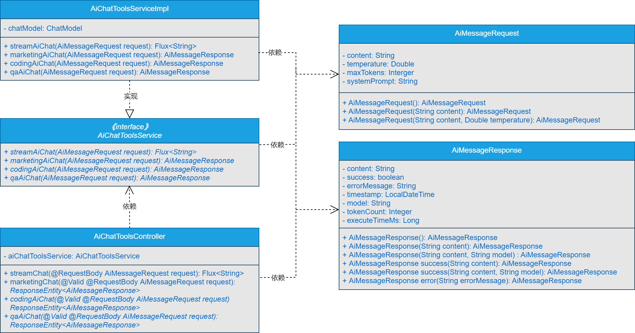 本节的实现中,主要是在AiChatToolsService接口、AiChatToolsServiceImpl实现类和AiChatToolsController类中新增了qaAiChat()方法。这个qaAiChat()方法就是一站式AI智能平台智能问答功能的核心方法。