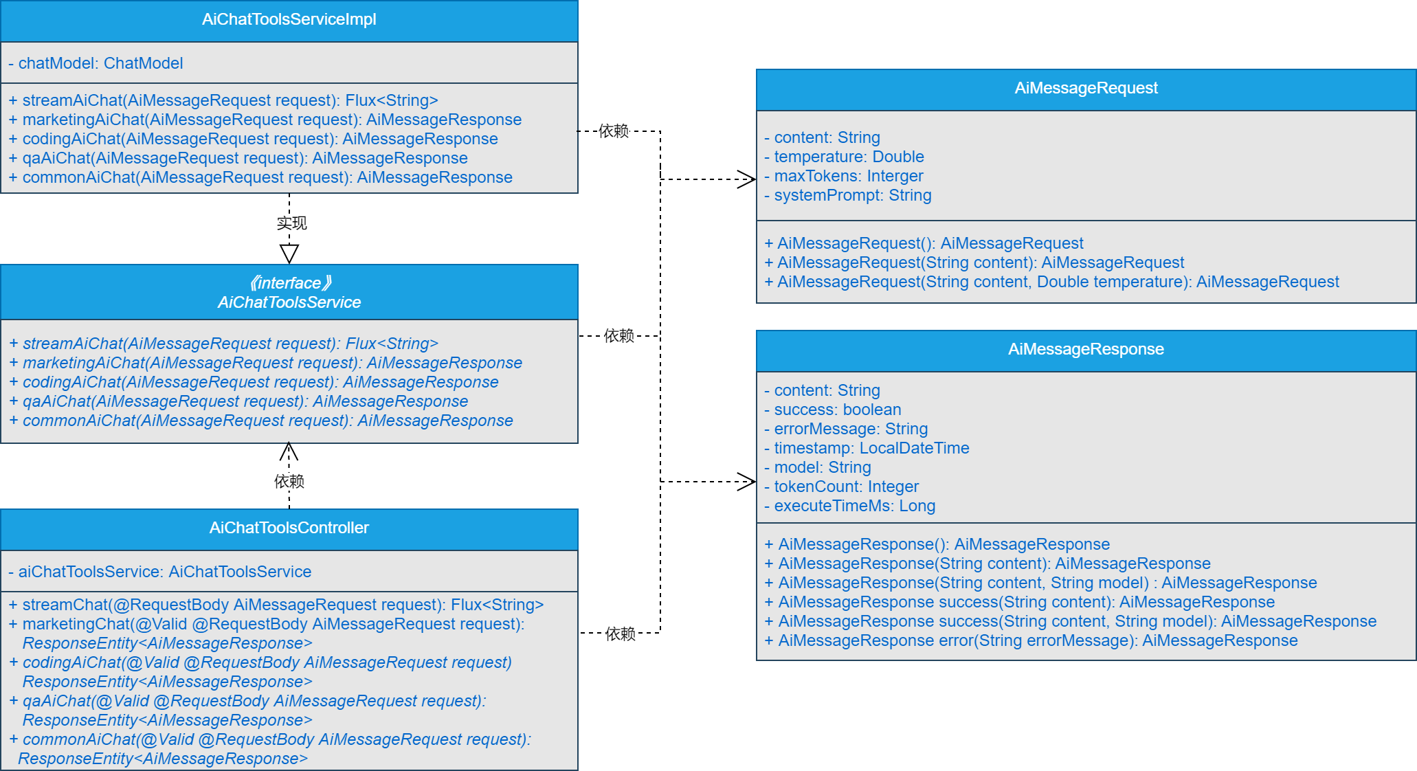 注意:本节只给大家展示一站式AI智能平台通用聊天功能的核心类实现关系,其他代码的实现细节,大家可以自行到本节对应的源码分支进行查看,这里不再赘述。