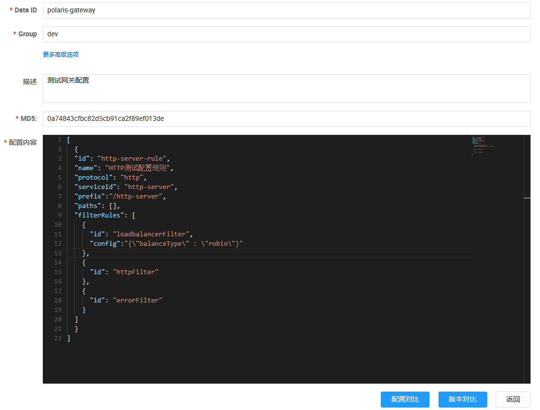 这里,以Nacos配置中心为例,在Nacos中添加服务配置。服务配置的DataId为polaris-gateway,Group为dev,配置内容如下: