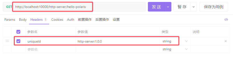 在请求头header中添加key为uniqueId的请求头,值为http-server:1.0.0。其中,值为后端服务的serviceId:version。也就是服务id:版本号。