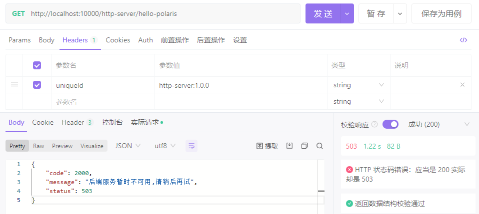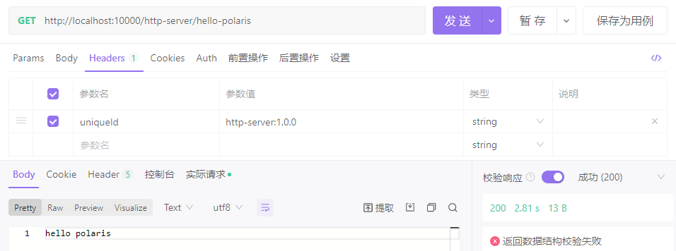 在apifox中,通过网关访问后端服务的接口为:http://localhost:10000/http-server/hello-polaris。