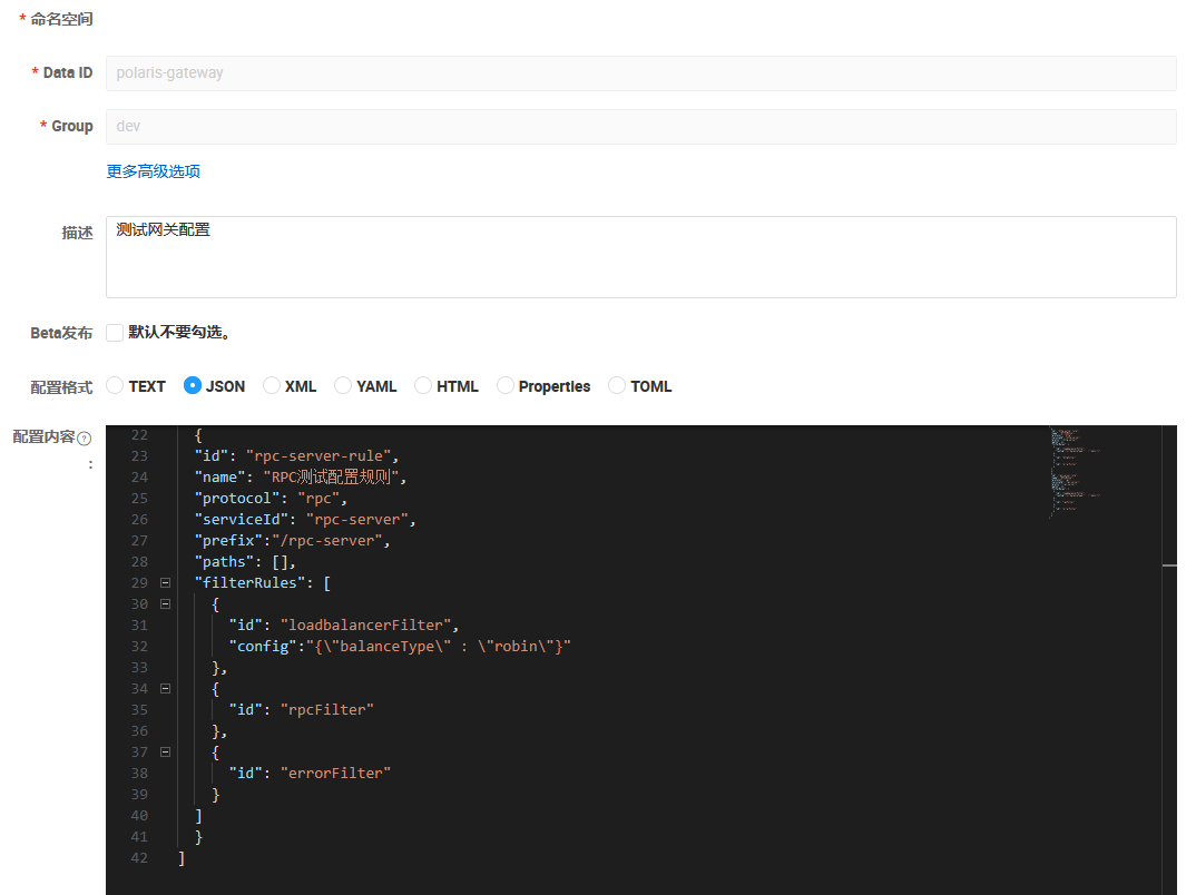 这里,以Nacos配置中心为例,在Nacos中添加服务配置。服务配置的DataId为polaris-gateway,Group为dev,配置内容如下: