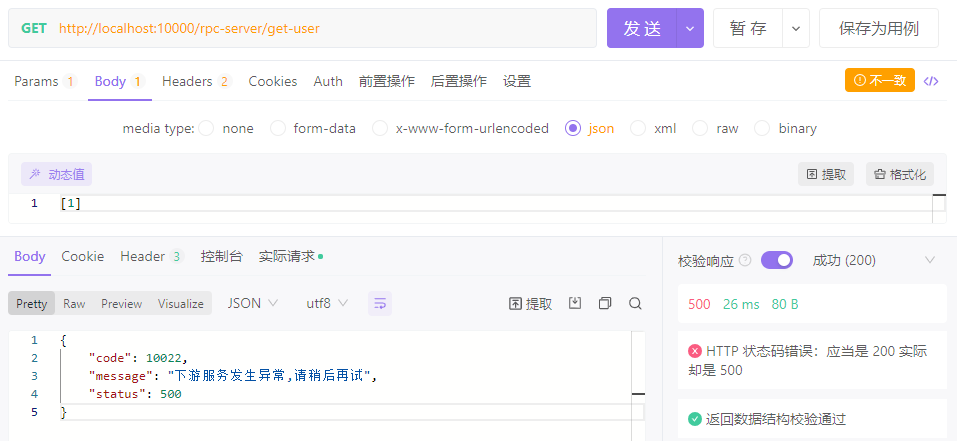 在apifox中,通过网关访问后端服务的接口为:http://localhost:10000/rpc-server/get-user。