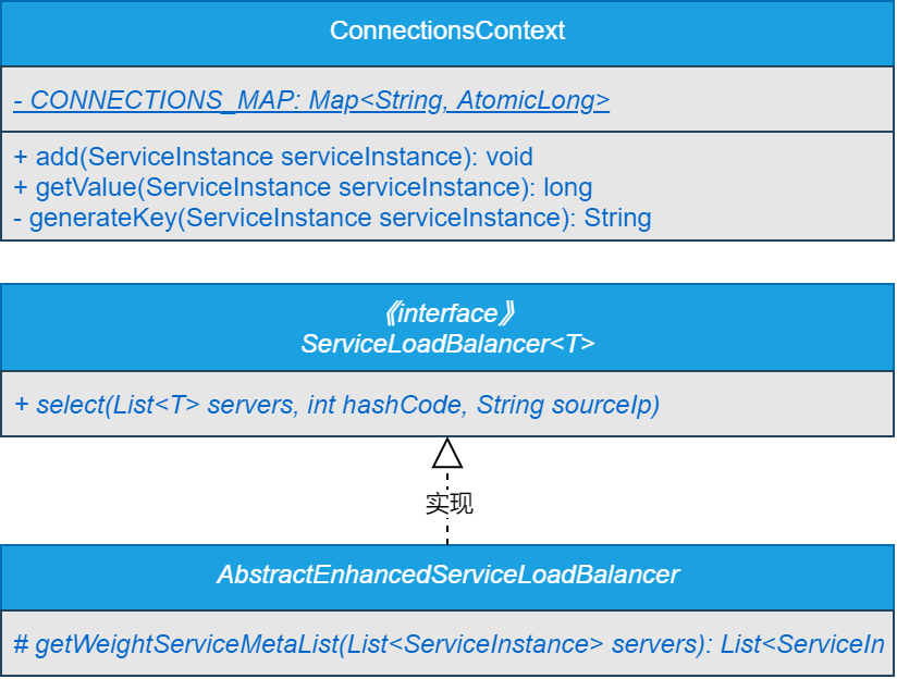 可以看到,在实现网关的负载均衡策略时,设计了通用SPI接口ServiceLoadBalancer,顶级抽象类AbstractEnhancedServiceLoadBalancer和连接上下文类ConnectionsContext。