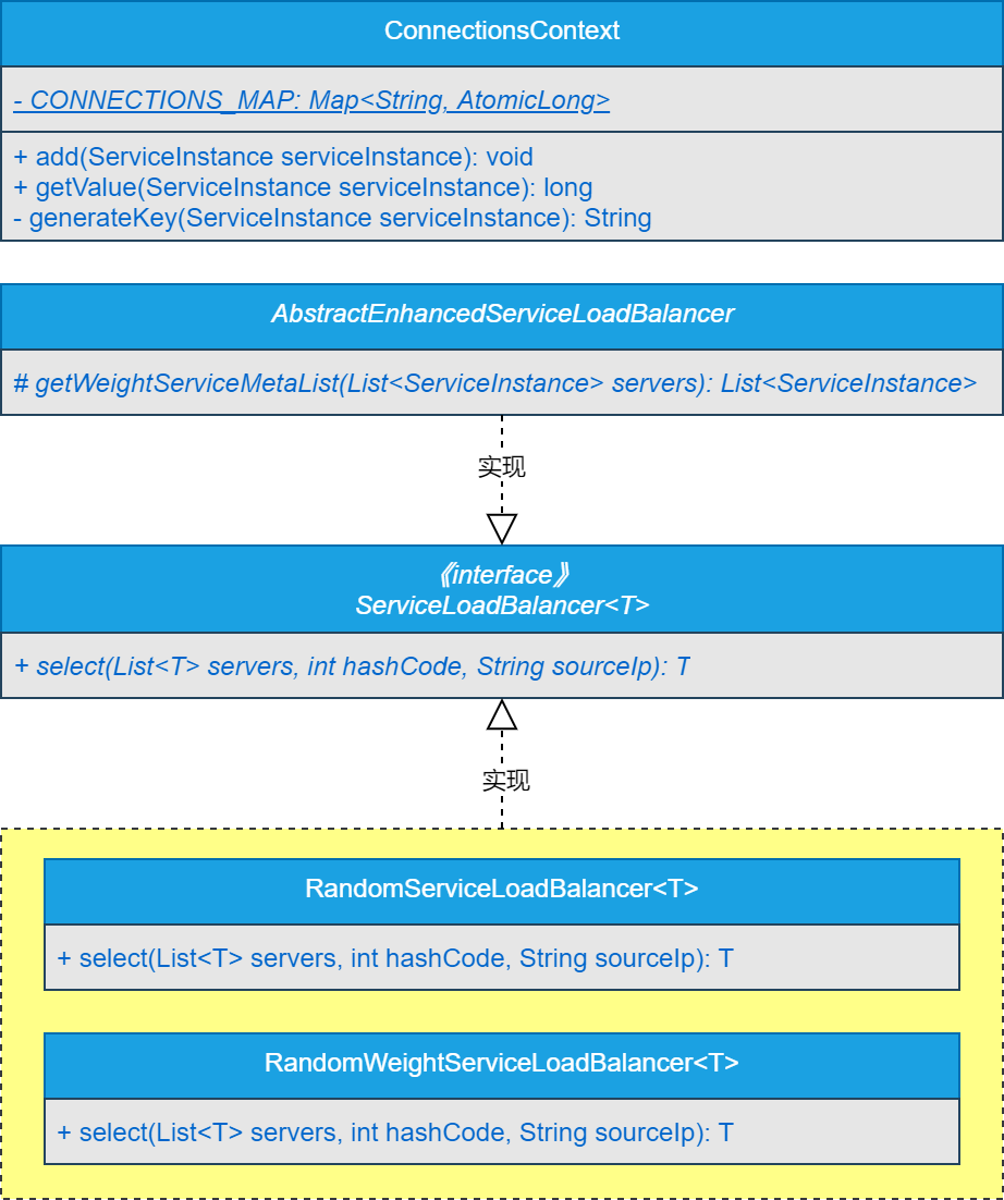 RandomWeightServiceLoadBalancer类是基于自定义SPI扩展实现加权随机算法负载均衡策略的核心实现类,主要从服务实例列表中通过加权策略随机选择一个服务实例返回。
