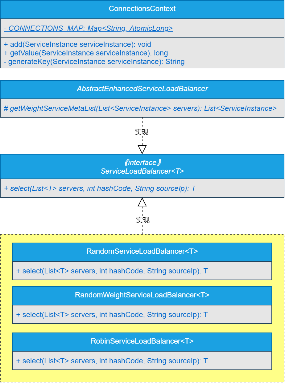 同时,在负载均衡篇章,已经完成了负载均衡通用SPI接口与顶级抽象类的设计与实现,并基于自定义SPI扩展实现了随机算法负载均衡策略和加权随机算法负载均衡策略。