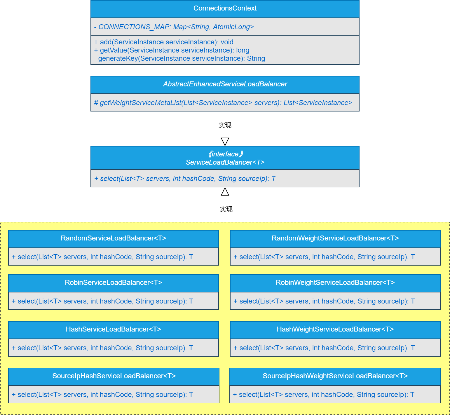 SourceIpHashWeightServiceLoadBalancer类是基于自定义SPI扩展实现源IP地址加权哈希算法负载均衡策略的核心实现类,主要从服务实例列表中通过源IP地址加权哈希策略选择一个服务实例返回。