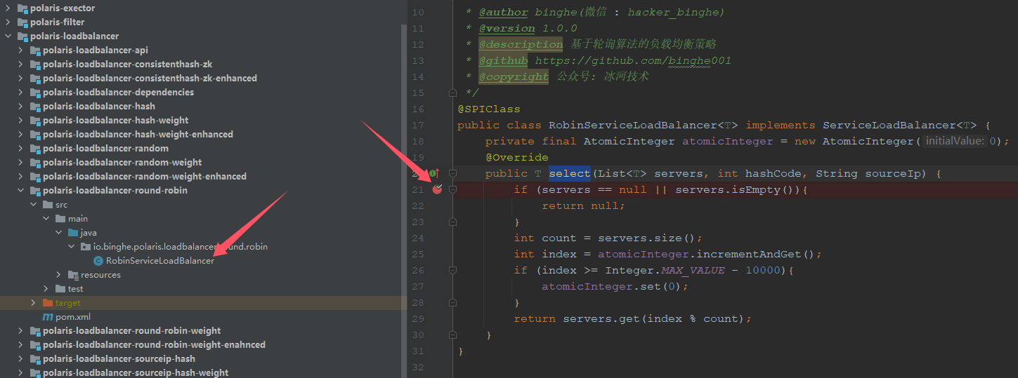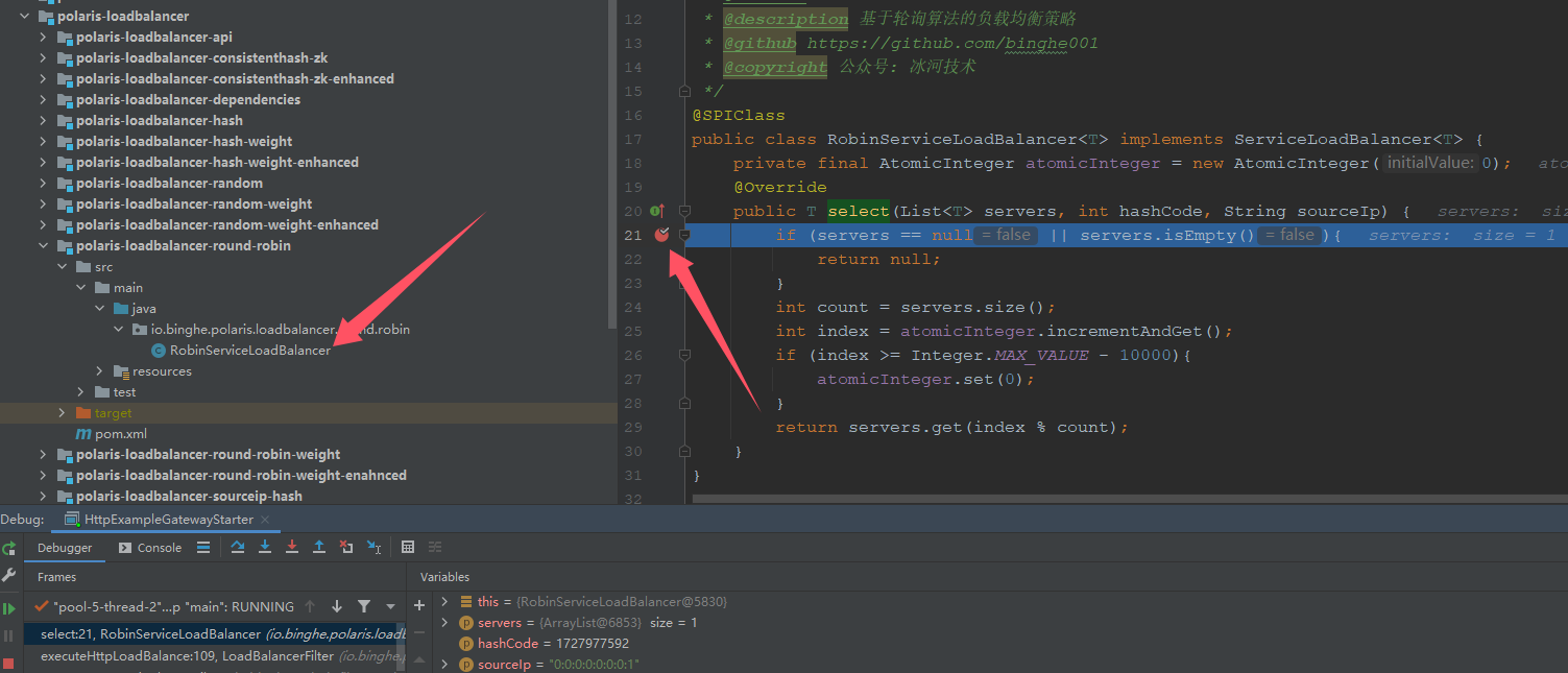 分别启动后端服务和网关,在轮询算法负载均衡策略的实现方法上打上断点。也就在polaris-loadbalancer-round-robin工程的io.binghe.polaris.loadbalancer.round.robin.RobinServiceLoadBalancer#select方法打上断点,如下所示。