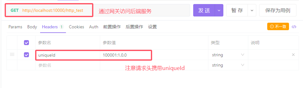 启动网关和后端服务后,通过Apifox访问http://localhost:10000/http_test,如下所示。