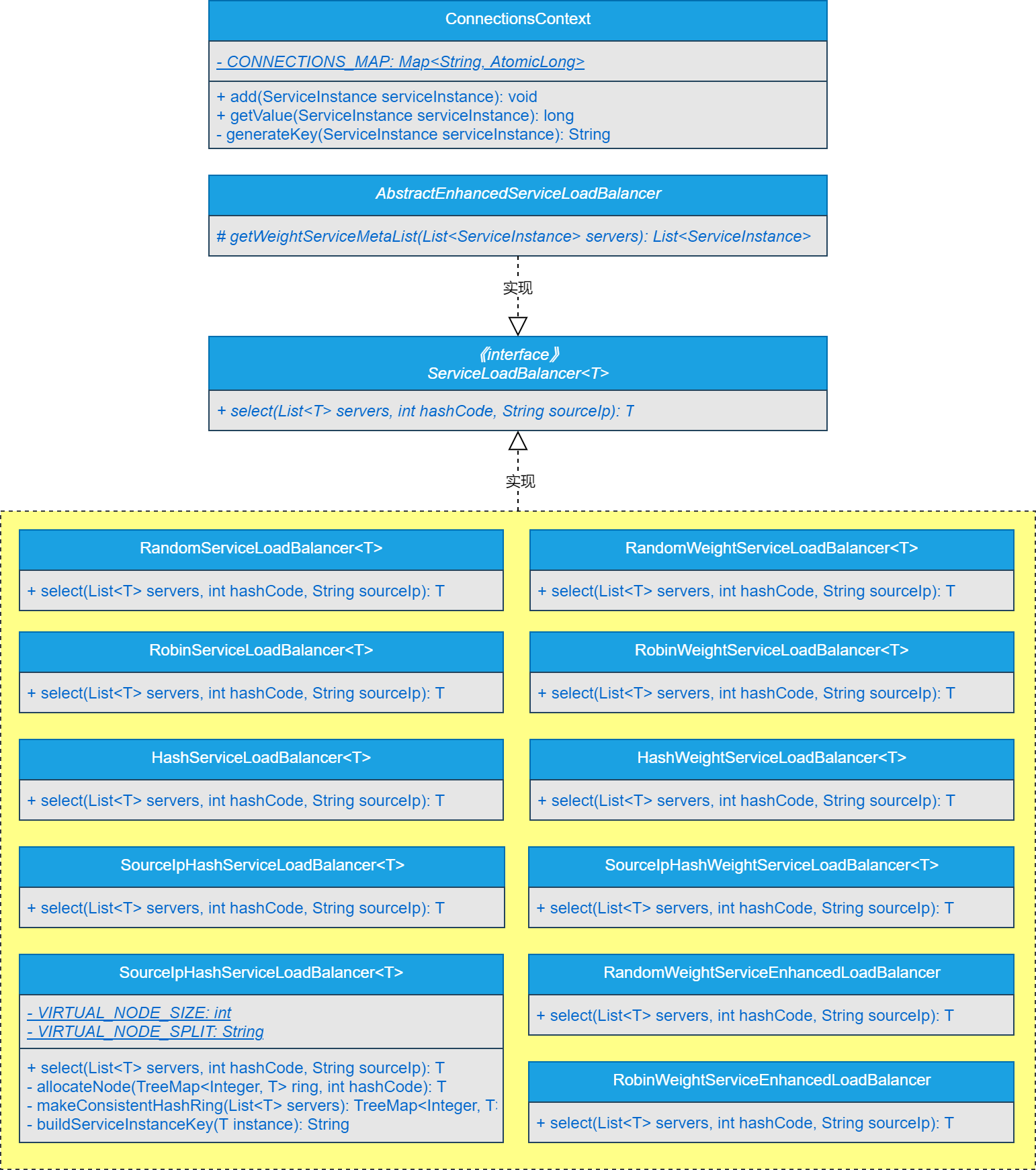 可以看到,基于SPI扩展增强型加权轮询算法负载均衡策略主要由RobinWeightServiceEnhancedLoadBalancer类实现。