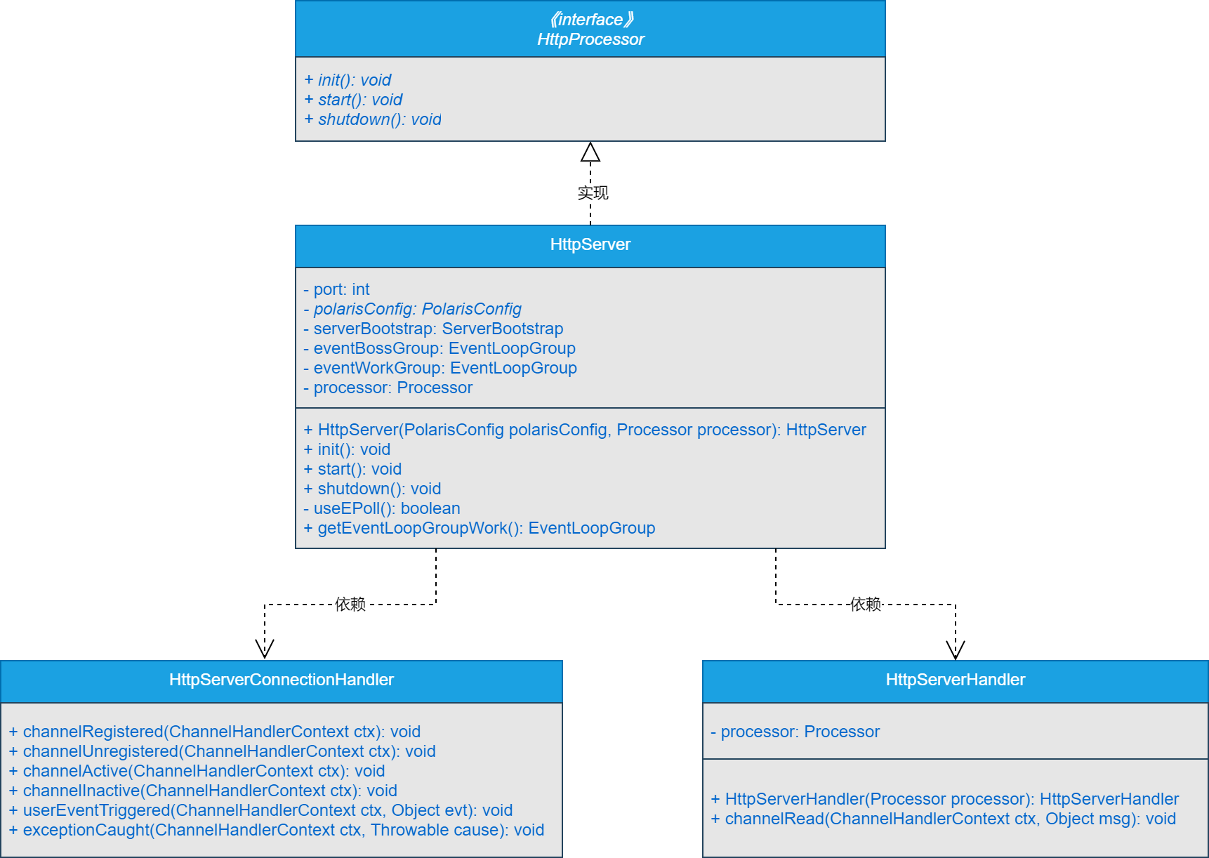 HttpServer类是基于Netty的服务端的主要实现类,实现了HttpProcessor接口,并实现了HttpProcessor接口中定义的init()方法、start()方法和shutdown()方法。并在实现的过程中依赖了HttpServerConnectionHandler类和HttpServerHandler类。