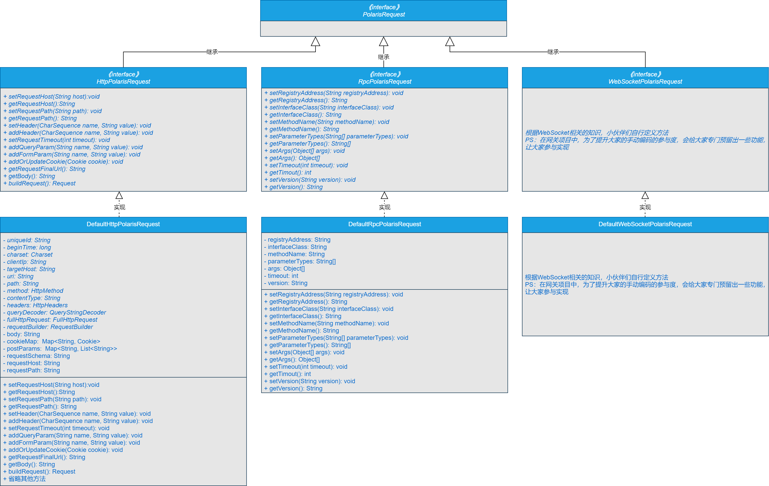 可以看到,在请求模型中,会分别对HttpPolarisRequest、RpcPolarisRequest和WebSocketPolarisRequest三个接口分别进行实现。并且在HttpPolarisRequest接口的实现类DefaultHttpPolarisRequest中,会根据实际需要定义比较多的字段来满足请求的需要。