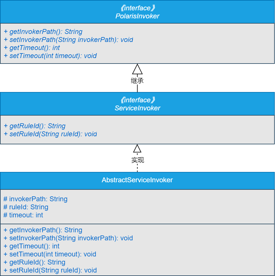 可以看到,在整个顶层调用链路中,我们进行了高度抽象化的设计。在最顶层设计了PolarisInvoker接口,在PoalrisInvoker接口中,主要设计了获取和设置调用链路信息的方法以及获取和设置超时时间的方法。随后,设计了ServiceInvoker接口继承自PolarisInvoker接口,在ServiceInvoker接口中,主要设计了获取和设置规则id的方法。同时,设计了AbstractServiceInvoker抽象类,实现了ServiceInvoker接口,在AbstractServiceInvoker抽象类中,主要定义了invokerPath、ruleId和timeout三个字段,随后实现了PolarisInvoker和ServiceInvoker接口中定义的方法。