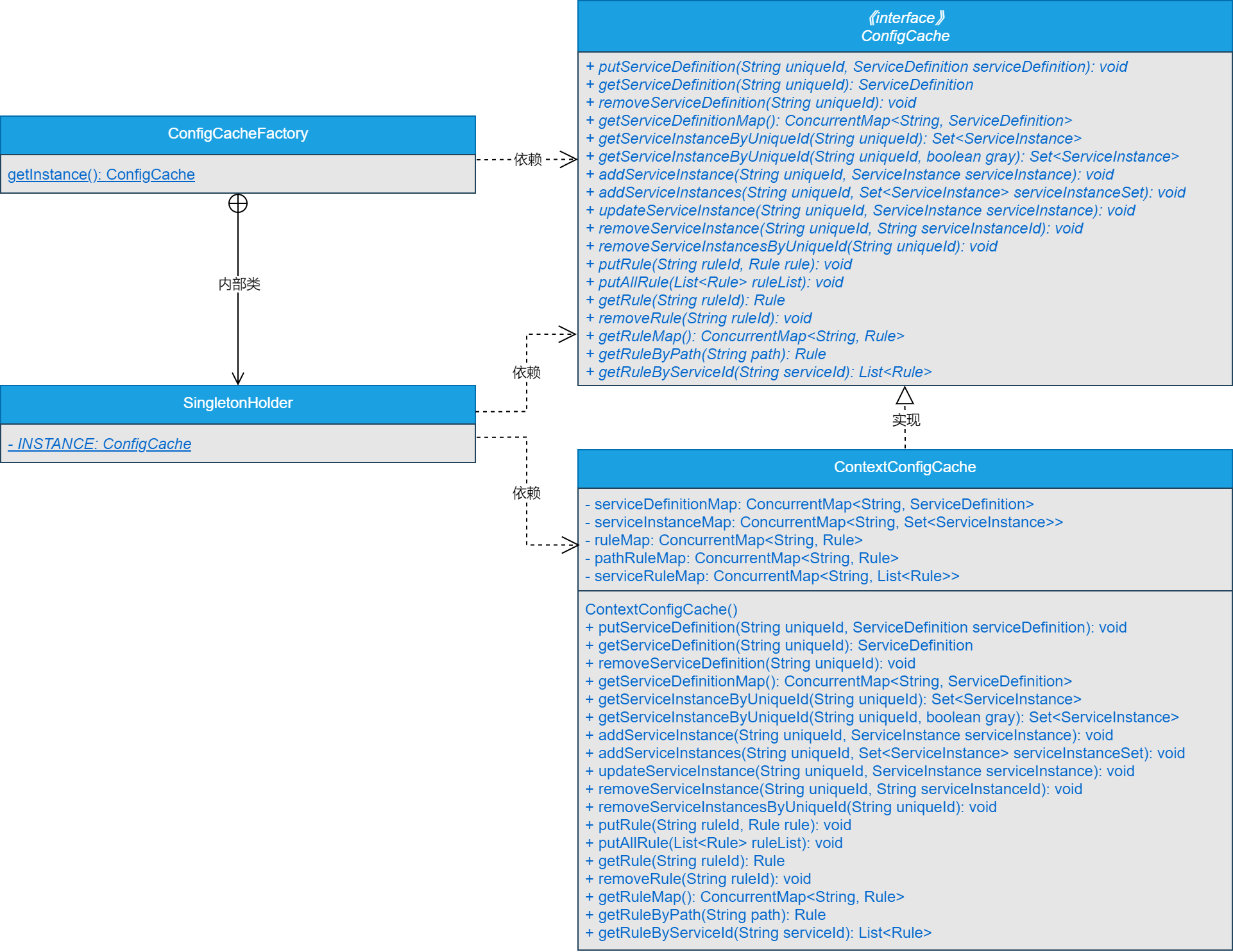 - ConfigCache接口:服务配置缓存接口,定义了服务配置缓存的常用方法,主要涉及到缓存唯一id和服务定义的映射关系、唯一id与服务实例列表的映射关系、配置规则id与配置规则的映射关系、请求路径与服务规则的映射关系以及服务与规则列表的映射关系等。