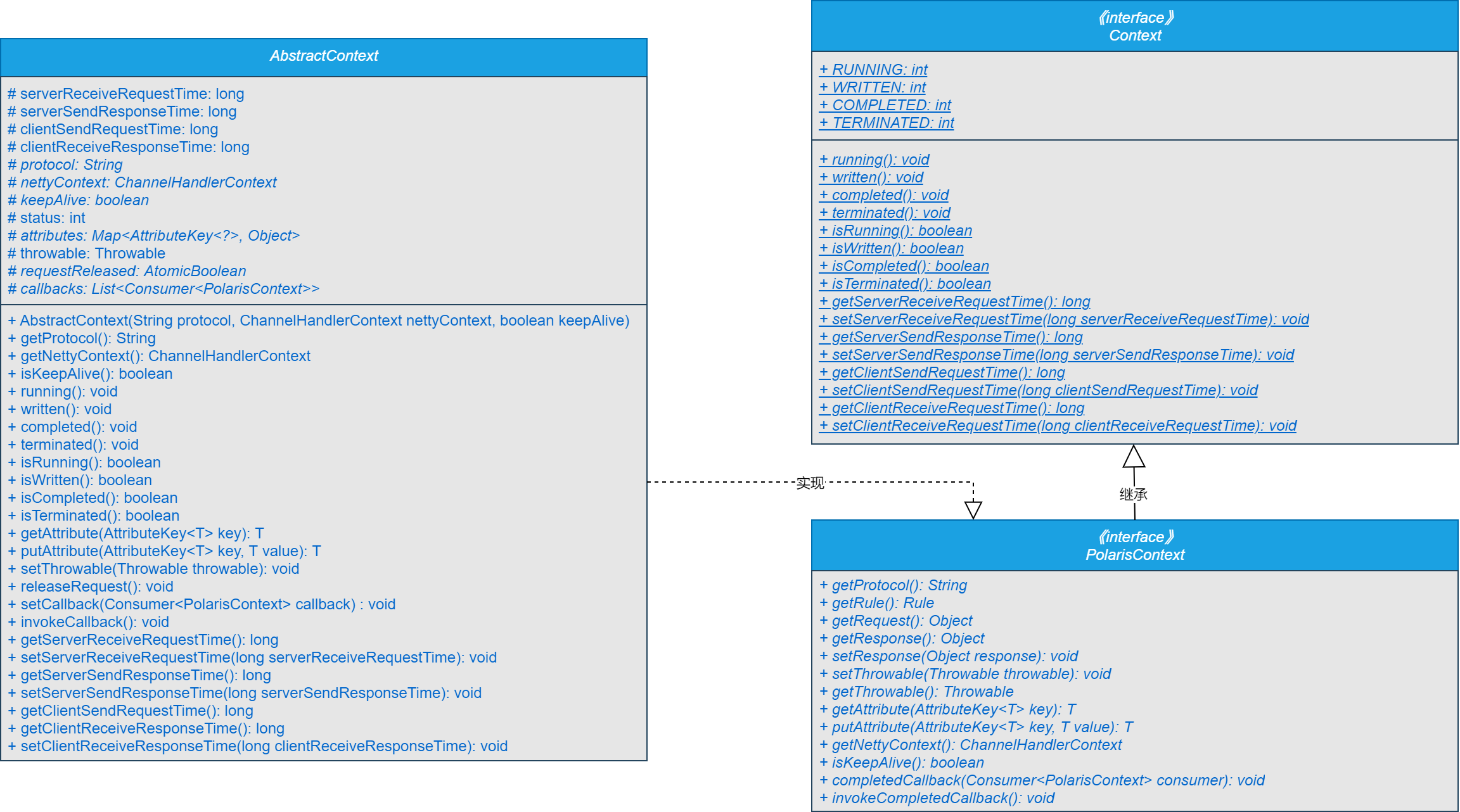 可以看到,在网关上下文的设计中,新增了AbstractContext顶层抽象类,主要实现了PolarisContext接口。
